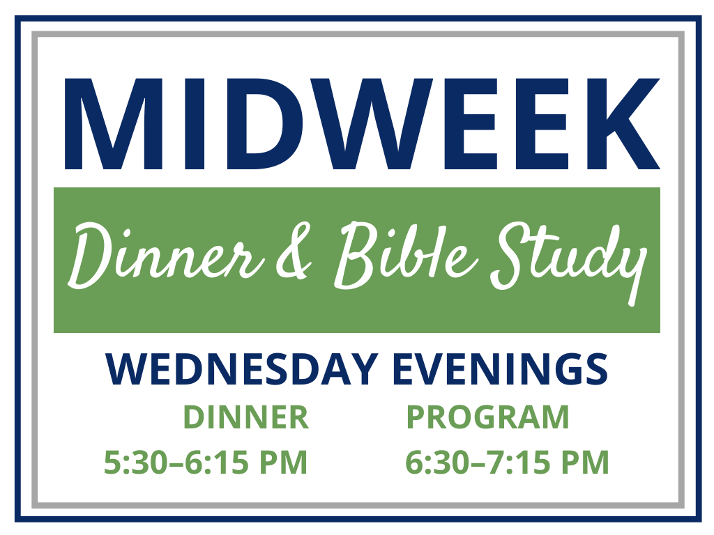 Dinner is served from 5:30PM - 6:15PM Midweek programs for all ages begin at 6:30PM